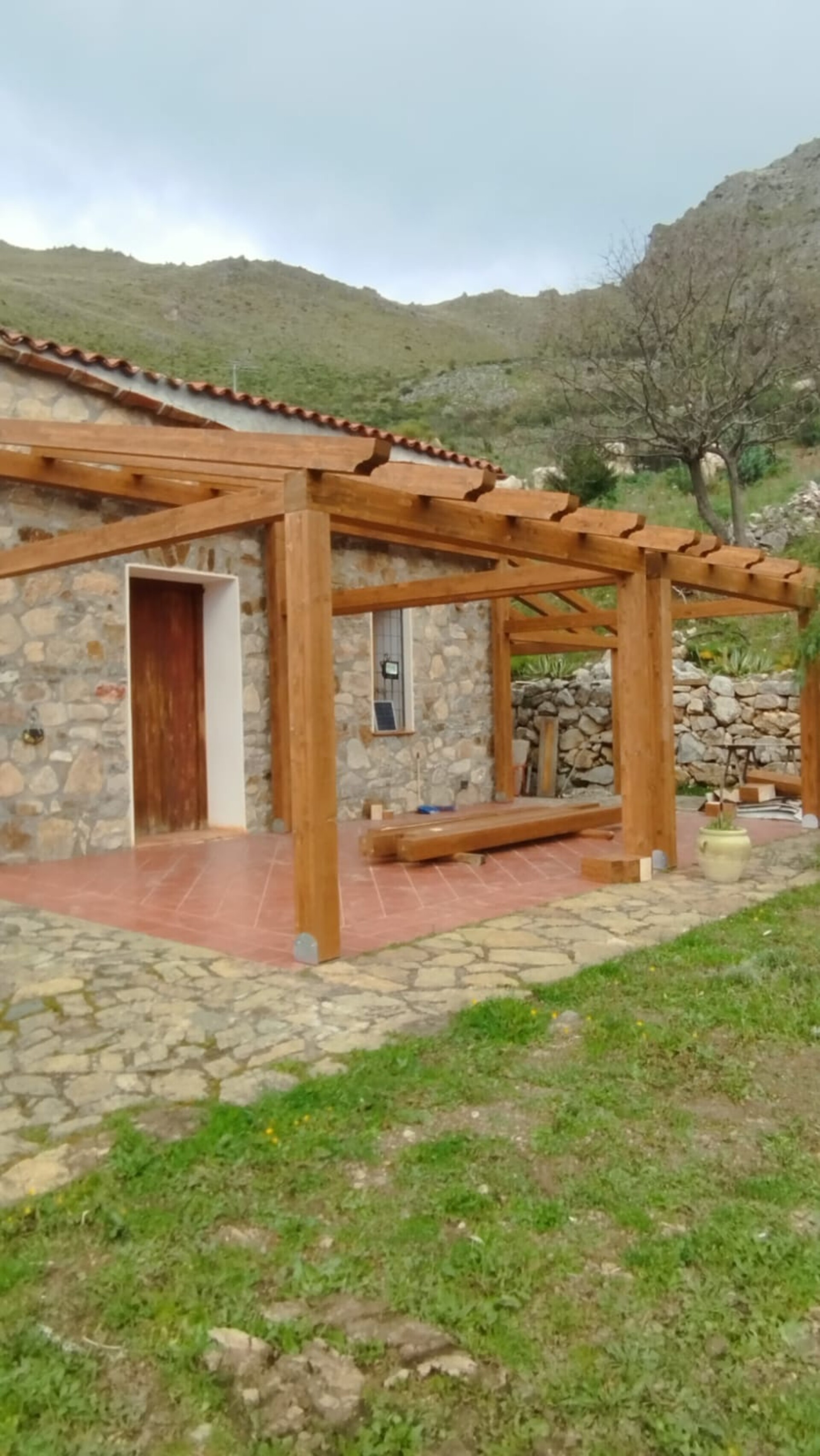 Tettoia in legno lamellare di abete impregnata color miele con coppo Siciliano